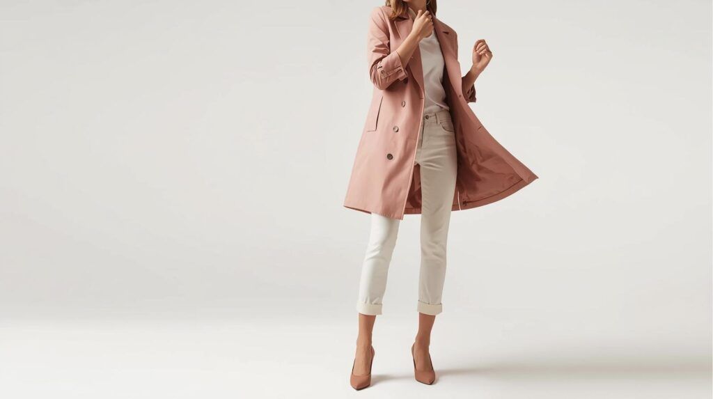 - Blush trench coat + white jeans + nude flats β fresh and light.