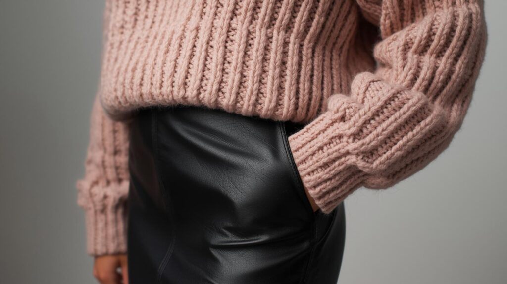 - Dusty pink knit sweater + leather skirt β soft meets edgy.