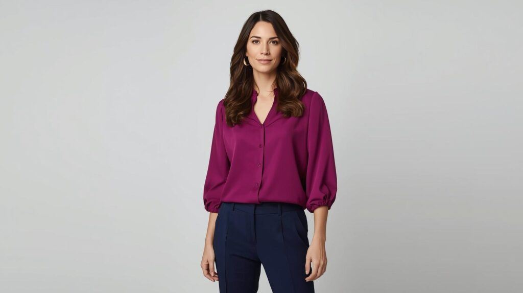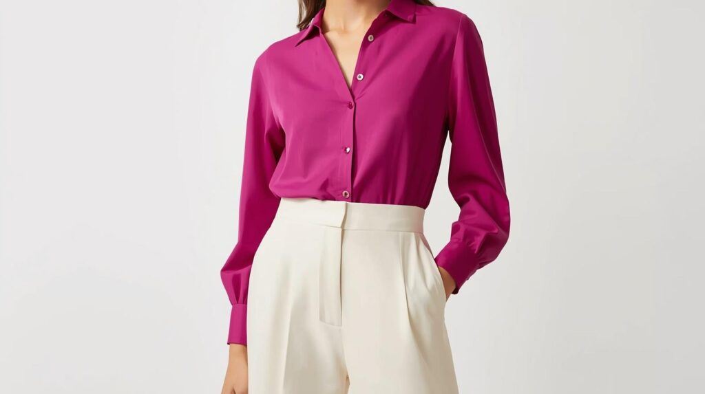 - Fuchsia blouse + cream culottes β bold but wearable.