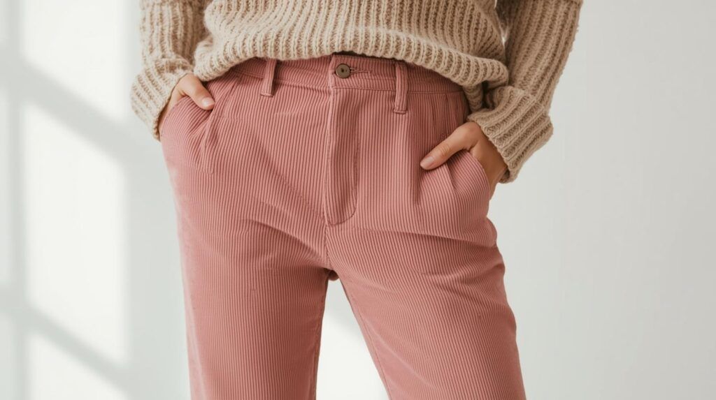 - Pink corduroy trousers + cream sweater β retro autumn vibe.