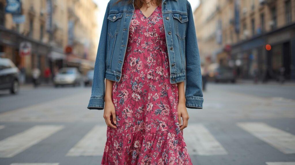 - Pink floral midi dress + denim jacket β perfect for weekend brunch.