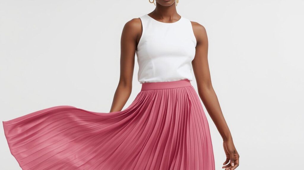 - Light pink crop top + pleated skirt β fresh and youthful.
