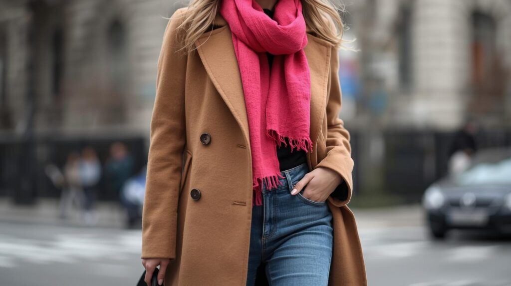 - Pink scarf + camel coat + jeans β cozy and classic.